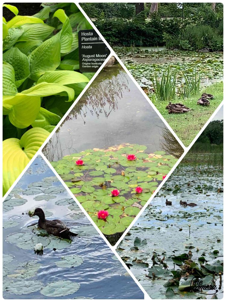 睡蓮が浮かび、その池のほとりに、カルガモが、群を成してお話し中⁉️