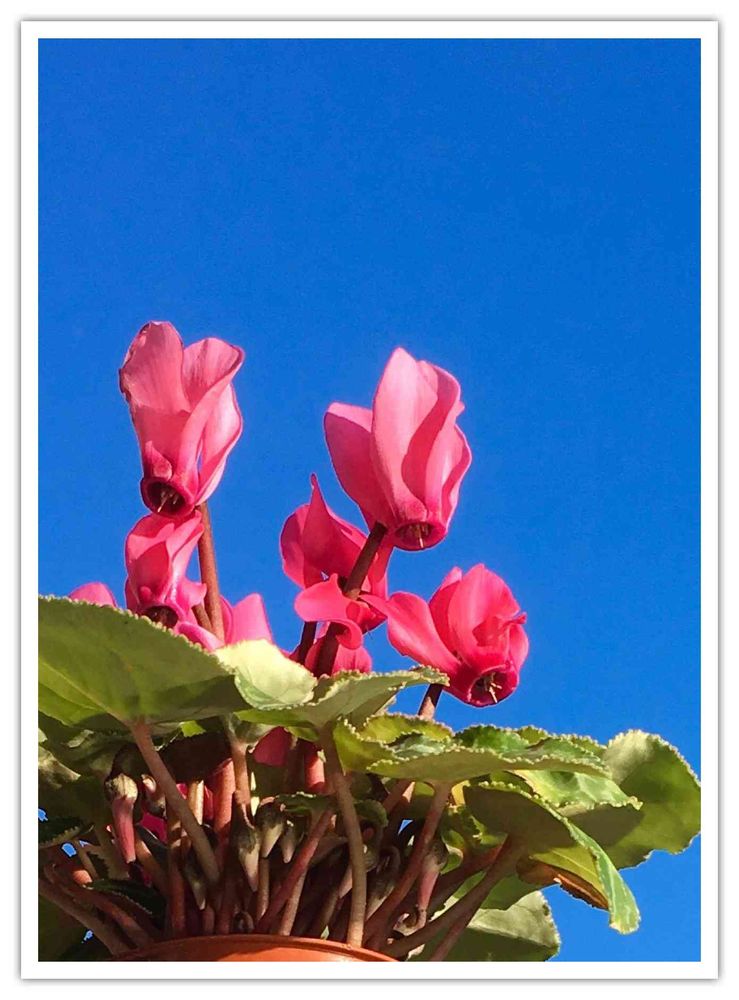 待機中蕾軍団がワチャワチャしているミニシクラメン、青空をバックに撮ってみました。な〜んか合成写真みたいで凄いので、投稿!(笑)