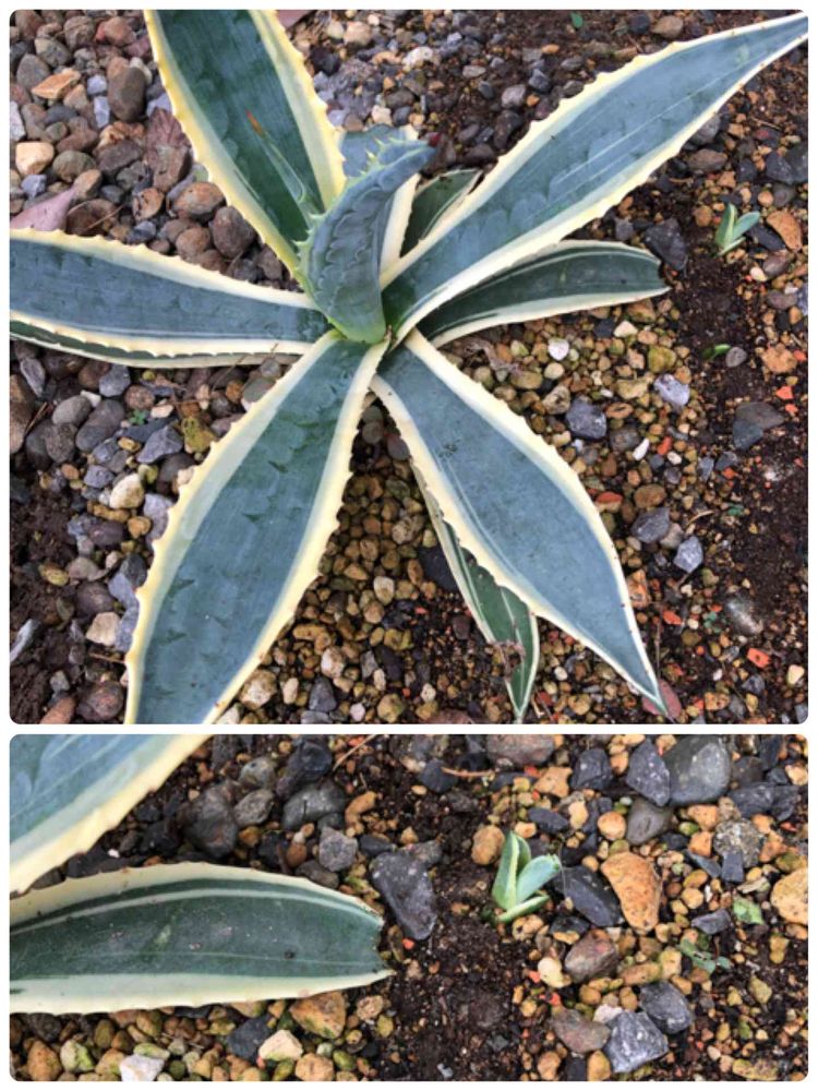 玄関横、アガベの地植え。順調に成長していて、何と❗️出来ました❗️子株❗️
