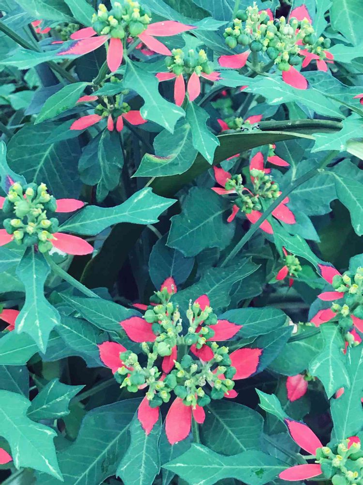台湾の少数民族の村に行った時、ポインセチアの群生見た時びっくりしました。沖縄に 2月に行った時、街路樹の下草みたいに植えてありました。