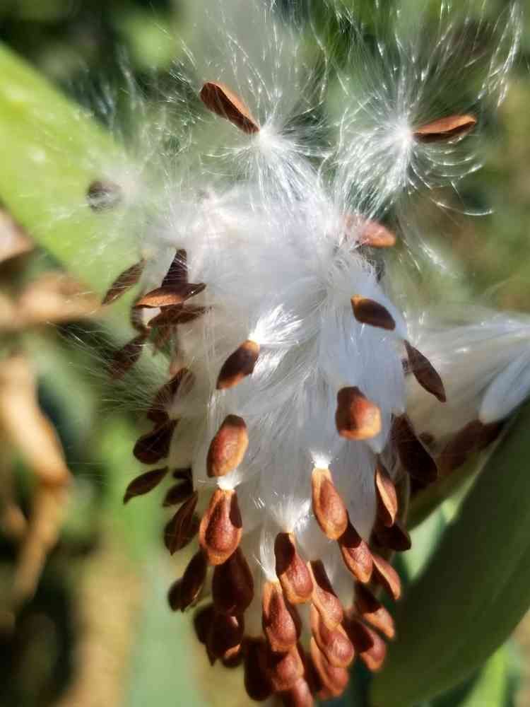 アスクレピアスも今年初めて育てたのでこの種から新しい🌱が発芽するのかまだ調べてないんですが、風に吹かれて🍆や🍅の葉っぱの上から他の花までこの種が乗っかっています。