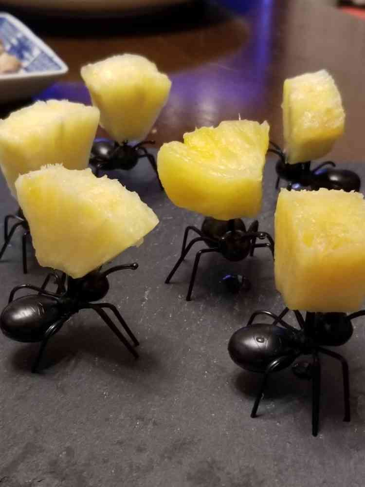 石みたいなお皿があったのでそこに娘が🍍をさした🐜さんを並べました。