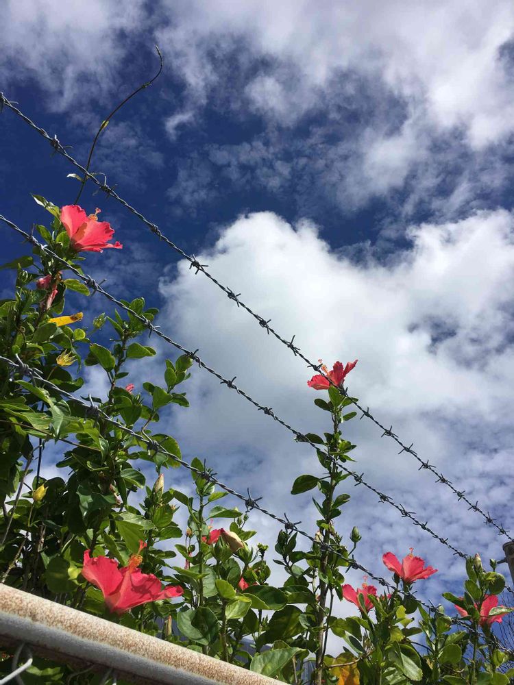 有刺鉄線とハイビスカスと青空のコントラストが👍👍👍