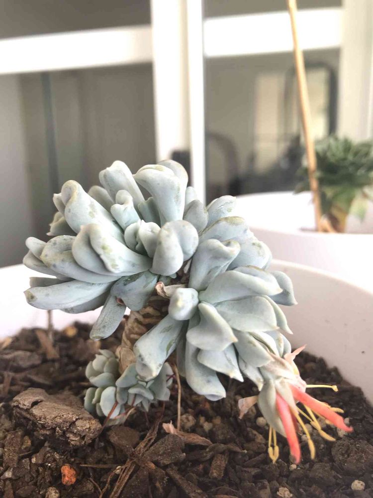 お花咲きました💕この子、トップスレンダーは2018/02/10のウェディングブーケに使った多肉のうちの一つ。カビ生えて中心丸っと毟ったりなんやりして不格好だけど、1年半目にして初めて花を咲かせてくれました✨