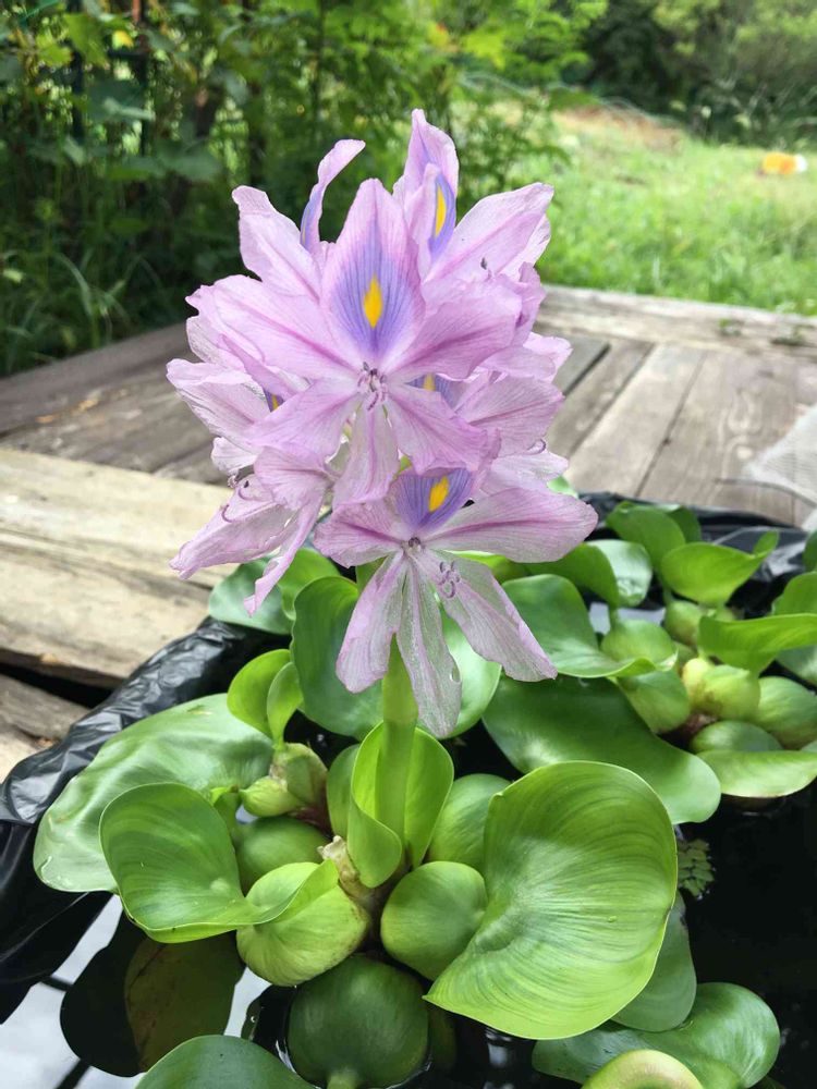 ビオトープのホテイアオイがきれいな花を咲かせいました。