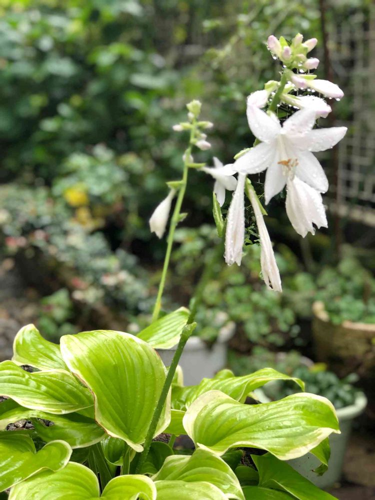 *☂︎*̣̩⋆̩降る庭で、やっとギボウシが花開きました。雨もしたたる可愛い姿でしょう🤗💕