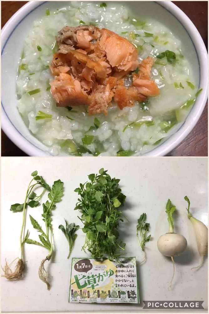 七草粥に塩鮭をほぐしてトッピング😋よい塩加減で美味しかったです💕