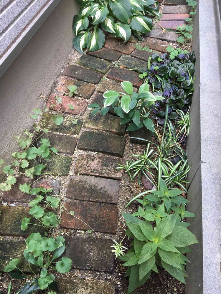 右手前の苗は何かわからないままとりあえずここに植えました。ベルガモットかもしれませんが名前がわからないです。ポットのままでは直ぐに水切れするのでこの場所でやってみたんですが、植えて2週間ぐらいでしょうか。葉っぱの色が薄くなり小さな虫が蜘蛛の巣のようになっていました。この場所ではあわないんですねー😖💦もう一度掘り上げして切り戻ししたところです。ギボウシの奥に植えたジュズサンゴ をこちらにもってこようかなあと思ってます。