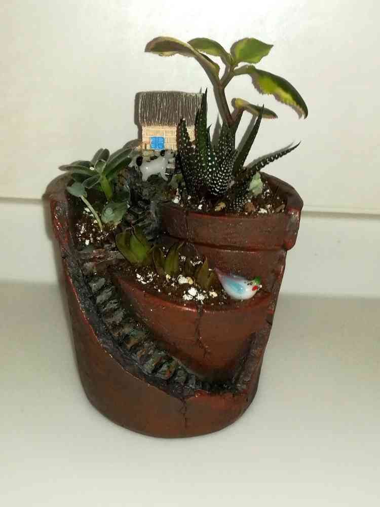 ネットで購入した飾り付きの鉢に、ドールハウス風に多肉植物と、ミニガラスの犬🐶と鳥🐦を入れ込んで、雰囲気が完成しました。☺️