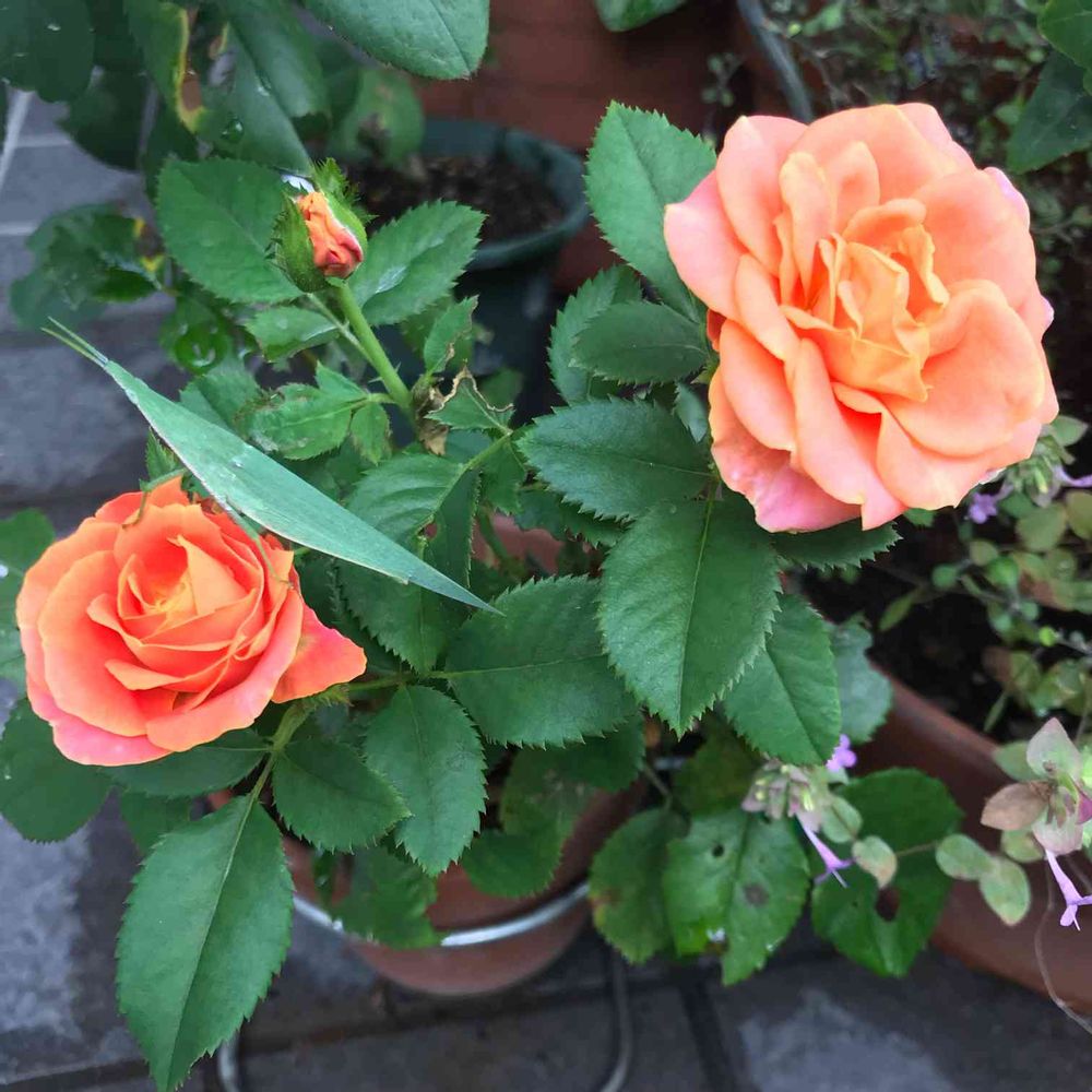 オレンジ色のミニバラ、綺麗に咲いたから1枚パチリと撮れば、お花の上に葉っぱ🍃いえいえ、バッタ君でしたΣ(・□・;)