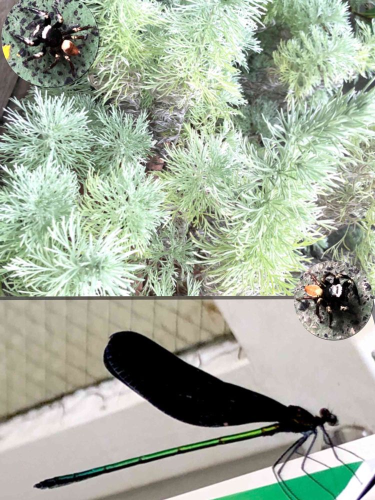 ハグロトンボ綺麗ですね〜蜘蛛は飛んで飛んでどこかへ逃げてしまいますね〜