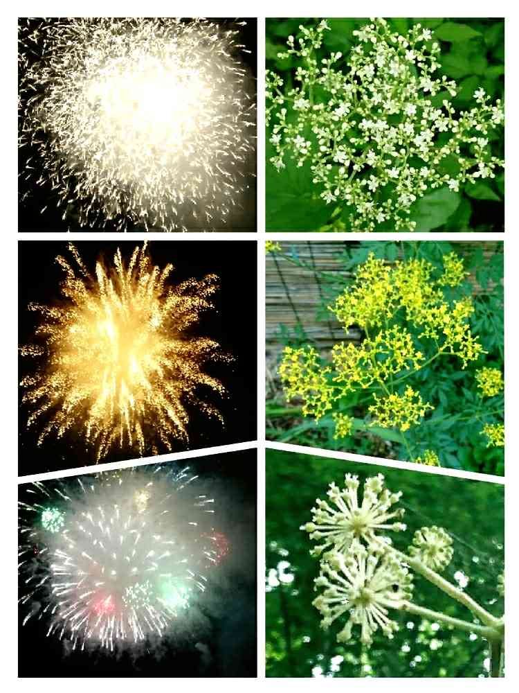 花火に似た花がかわいいと思ったら、ほんとの花火と対比させたくなりました。