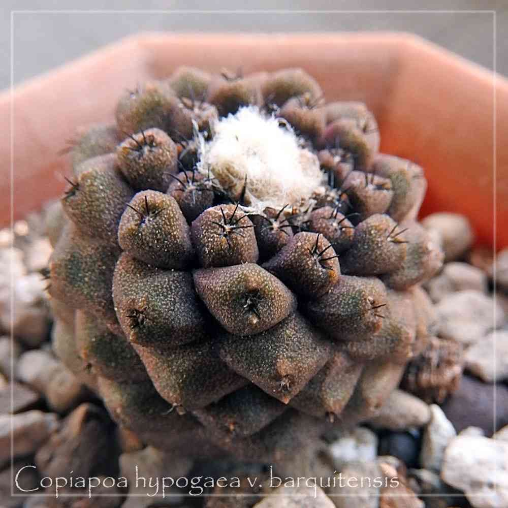 サボテン、コピアポア属ヒポガエアの変種、バルクテンシス。和名が紫鱗竜ということになるらしい。ただし、今は紫というより褐色。小さくて、艶消しで地味~な色合いの渋いサボテン。
