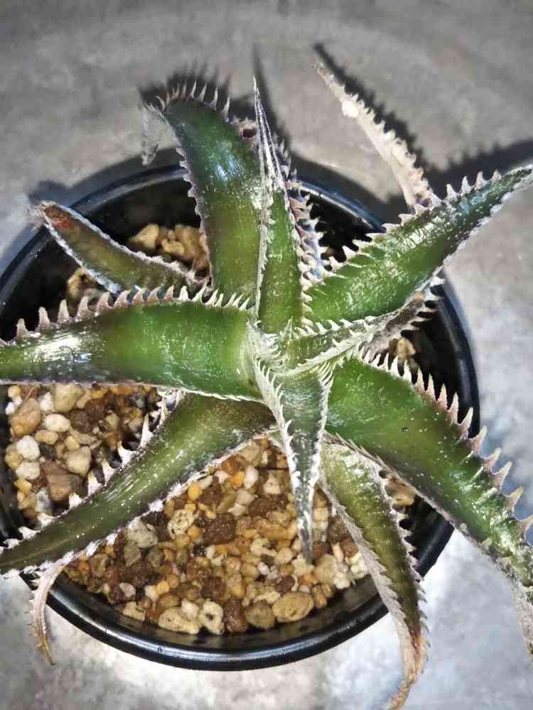 春先のイベントでお迎えしたディッキア。紅葉してたんですが緑になってきました。根っこが活着しないうちに直射に晒して乾かしてしまったのでちぢれて大変な状態だったのですけど、毎日たっぷり水やりして遮光したらこんな感じに。ブロメリア協会の会長さん由来の株と言われたのですけど、さてこれからどうなるか
