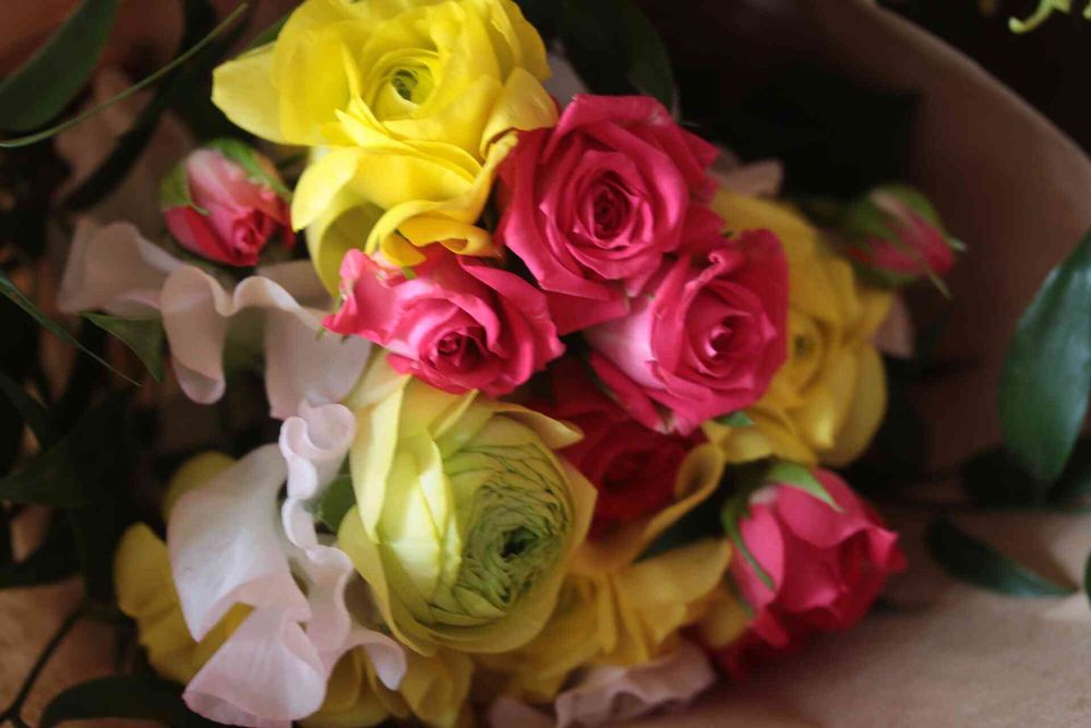 可愛い黄色のラナンキュラス、スイトピーと春感いっぱいのブーケができました💐