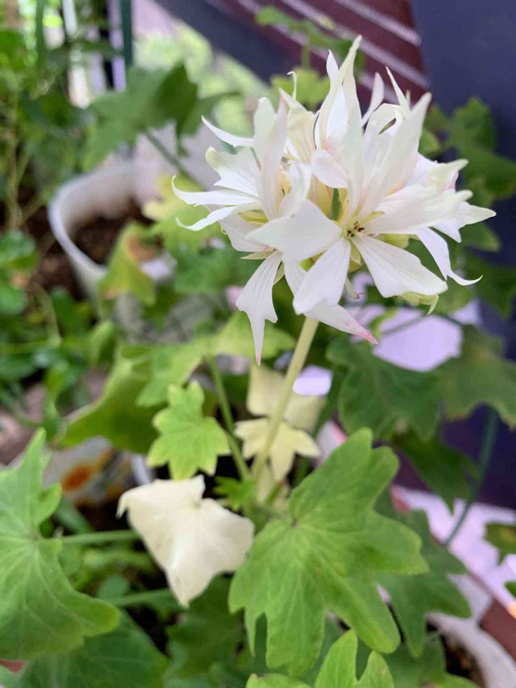 星崎ゼラニウムまた一輪🥀でも、赤い斑入りではない👀💧葉っぱ🌿も白っぽいし…