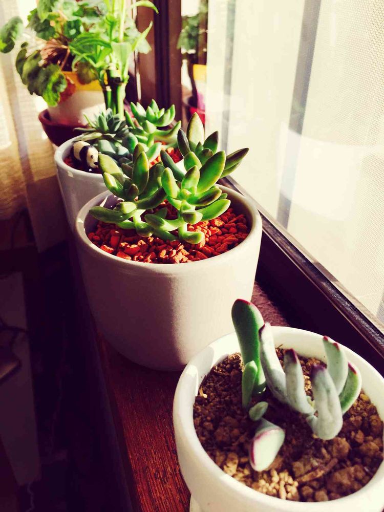 初めて育てる多肉植物たちです。可愛くて癒される!ステキな窓辺になったかも!
