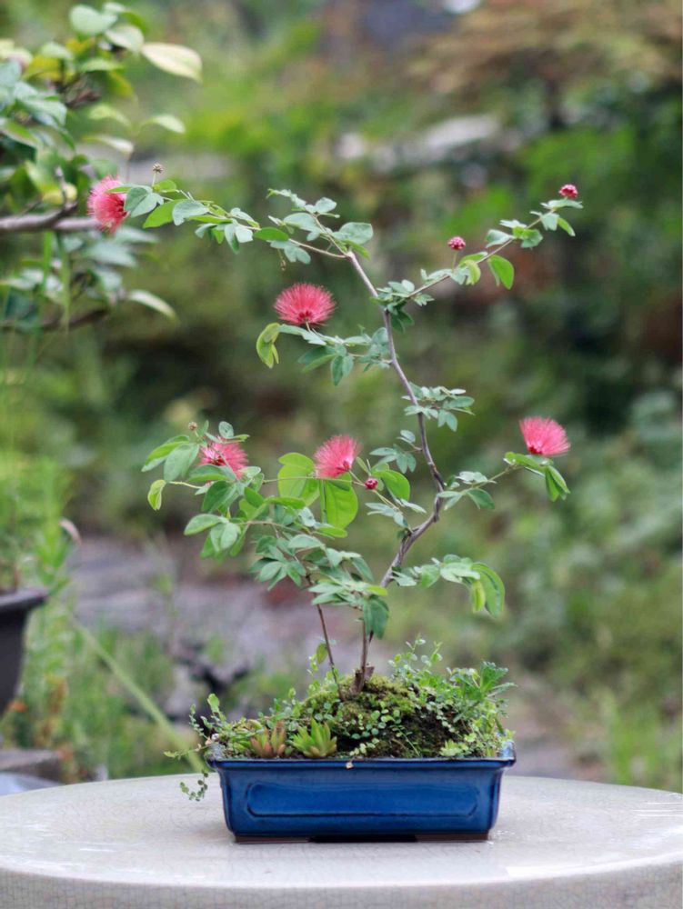 ネムノキは大きな木に薄ピンクの花が咲いているものだとばっかり思っていたのですが、盆栽にも仕立てられるんですね。可愛い💕
