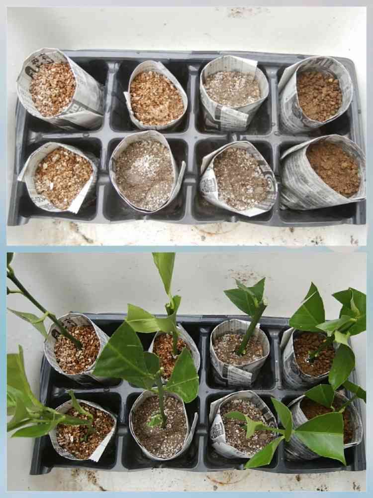 剪定したレモンで、挿し床の比較実験をしてみました。右が赤玉土100%2つ。真ん中が市販の種蒔き挿し木用土3つ。左がバーミキュライト100%3つ。いずれも新しい清潔ものを使用。これまでの経験では、市販の挿し木用土はダメで、赤玉の成績がよかった印象です。バーミキュライトのみは今回初めて。さあ、どうなるかな?