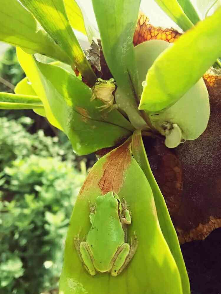 上の葉っぱの カエル🐸さんの表情が……なんとも言えません🤣🤣🤣