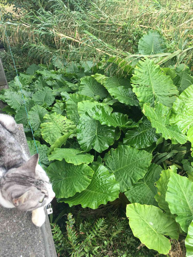 この猫野良猫🐈で人間が近づくと逃げるんです。どうしてもクワズイモと一緒に写したくて