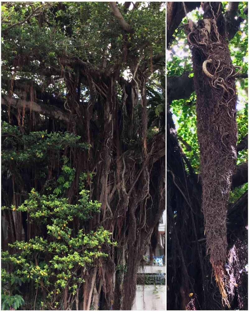 付近に小学校が有り歩道の一角に有るためか、気根を伸ばすのを許されず、太い幹を中心に垂れ下がっては切られた(?) 多数の気根がまるでドレッドヘアのようになってます😅