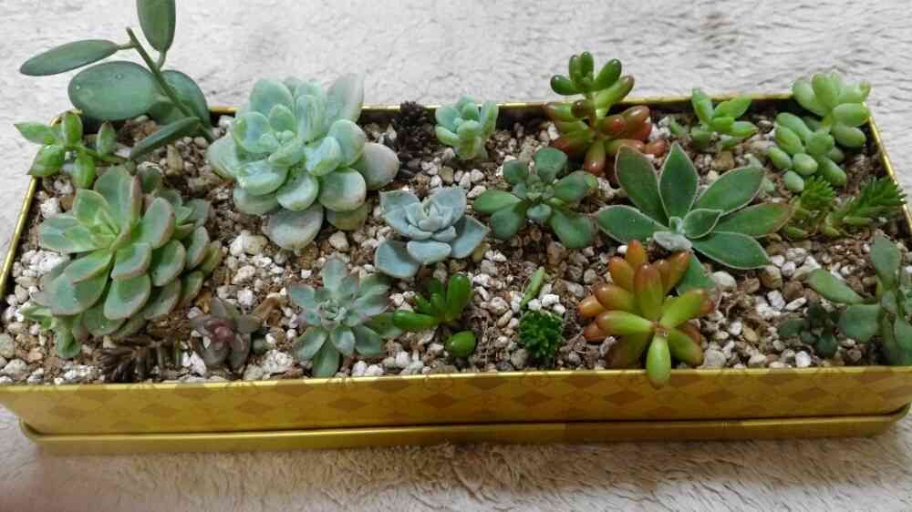 旦那からの出張土産でもらった、名古屋の海老煎餅の缶に寄せ植えました( ˙꒳˙ )
