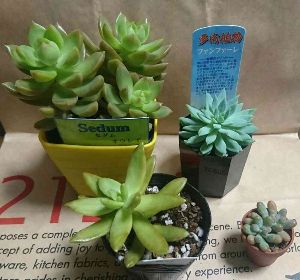 前から気にかかっていたファンファーレと、色味にビビっときた黄麗と銘月、そして名前は分からないけどフォルムに魅了されてちっちゃいセダム(?)をお迎えしました🎶