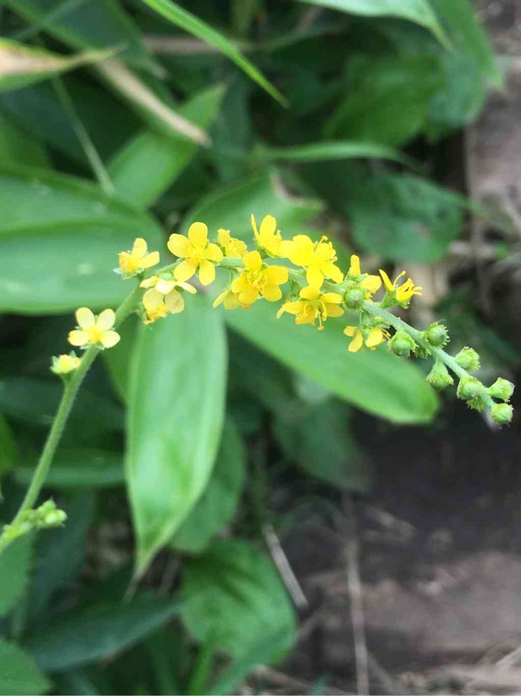 長くのびた茎の上部に黄色5弁の小さなお花を穂状につけます💛