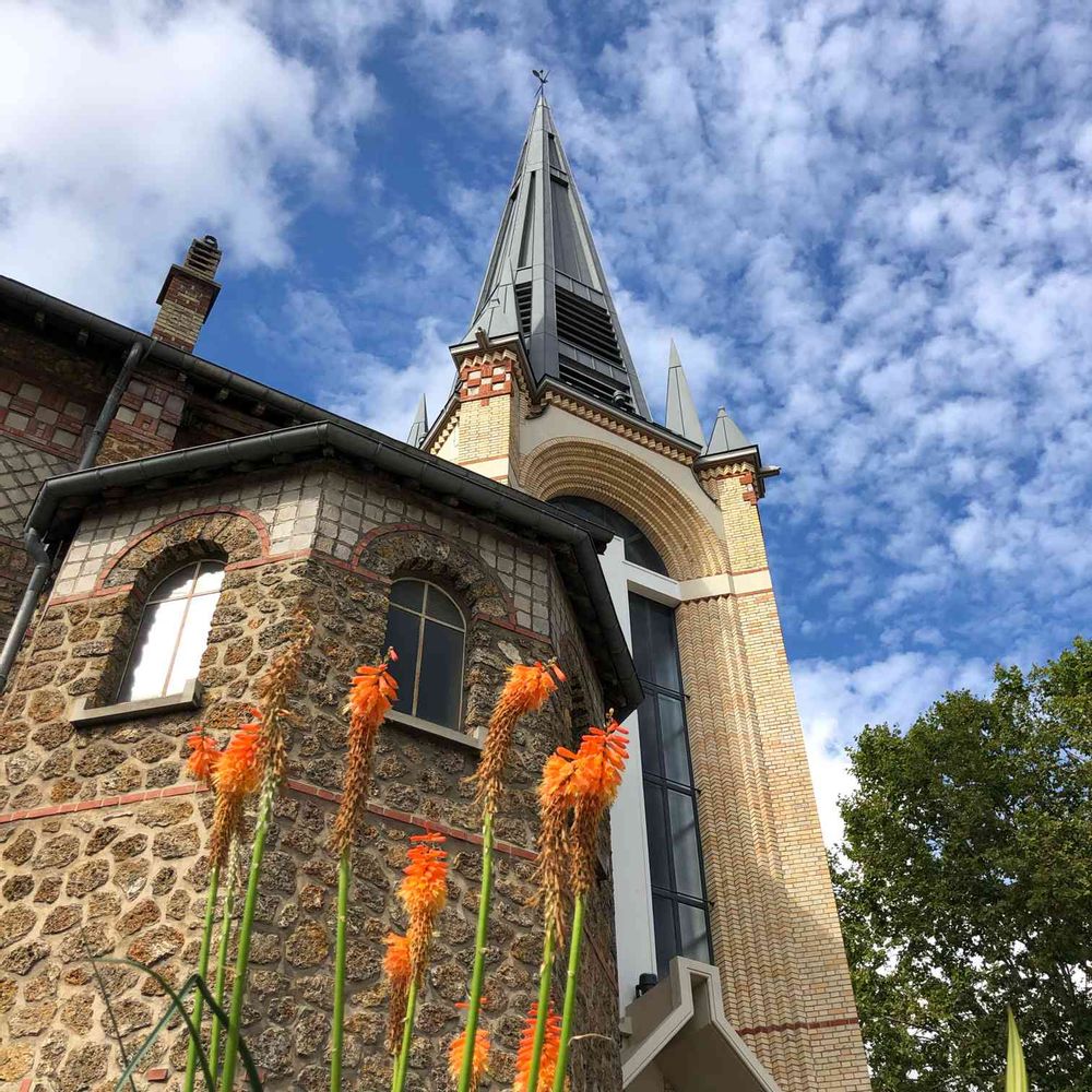 建物は教会なんですよ。マルシェの隣にあるので日曜日の朝通りかかると礼拝の讃美歌が聞こえたりします。
