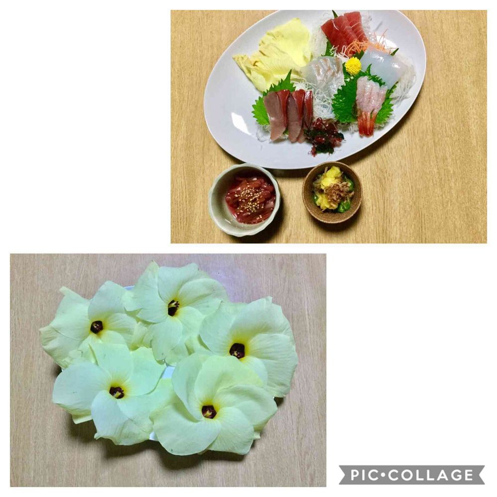 刺し身の下左はヤツガシラの茎の甘酢合え スコと呼ばれる所もあるようです。おとなりは花オクラをさっとお湯をくぐらせたものとオクラのゆがいた物、三杯酢、花鰹をかけました。