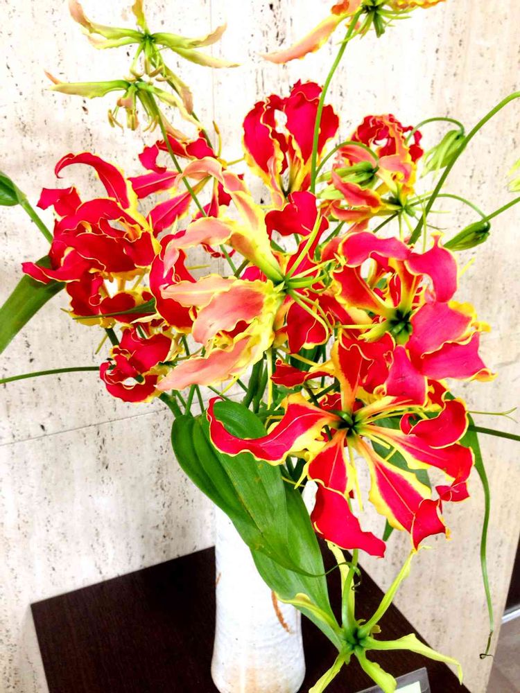 今朝の職場の花を撮りました。花はグロリオサです。花言葉は栄光、勇敢などがあります。^ ^