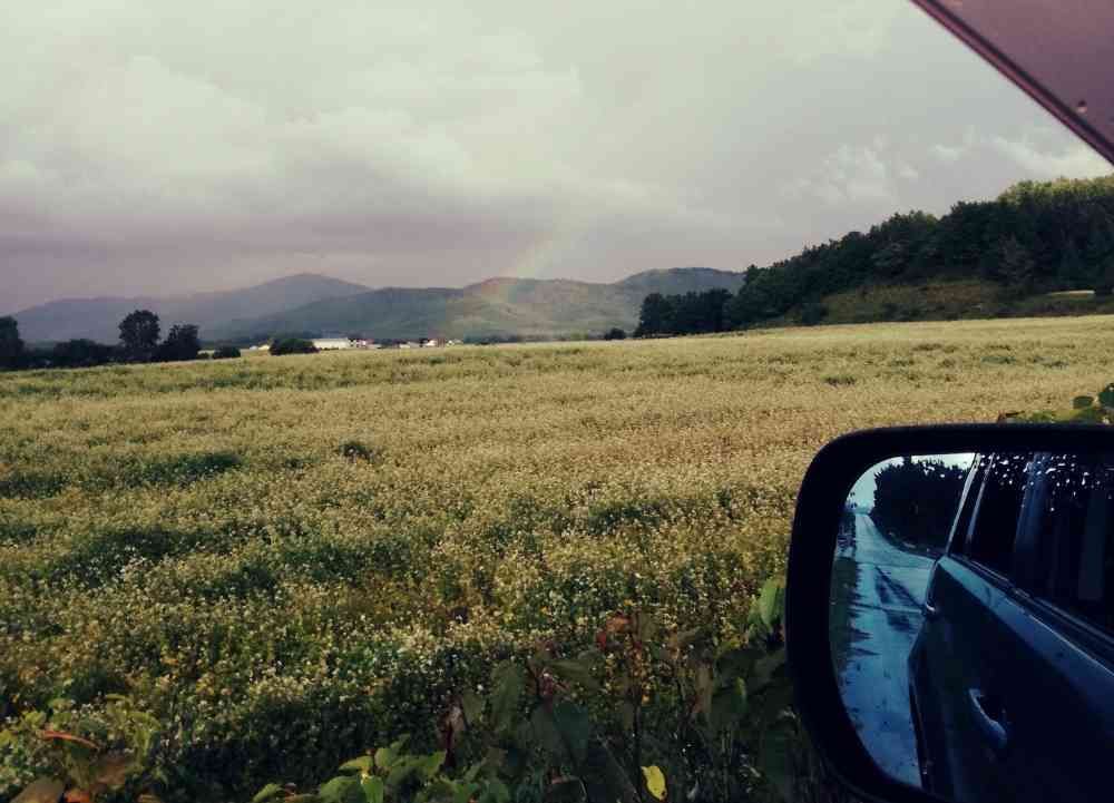 出かけた道北で一面の蕎麦の花に出逢う。その先に虹がかかっていました😄