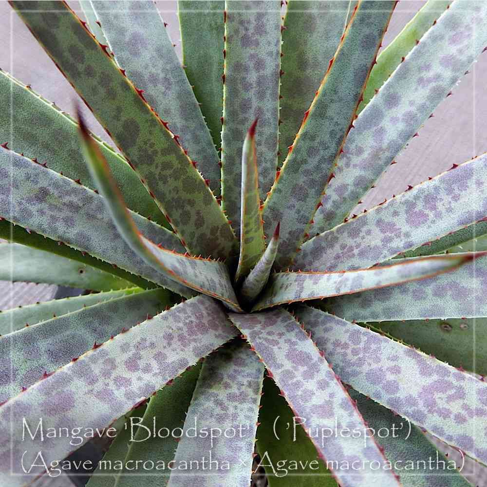 マンガベ、パープルスポット。普通にアガべで紹介されてるけど、アガベ(マクロアカンサ)と近縁種のマンフレダ(マクローサ)の交配種だからマンガベ。この特徴的な斑点は、マンフレダのマクローサ譲りらしい。