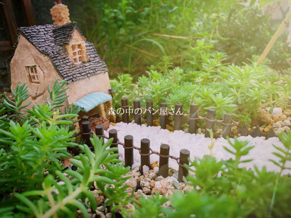 小さな花壇に、小物を置いてスマホで接写してみました 実際は少ないセダムが茂っているように見えます