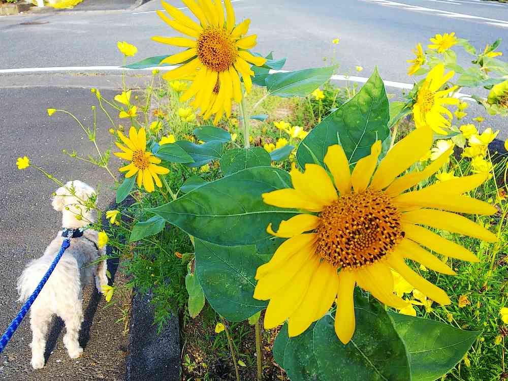 黄色の花畑に、ラッキーちゃんの可愛い後ろ姿、元気をもらいました😍