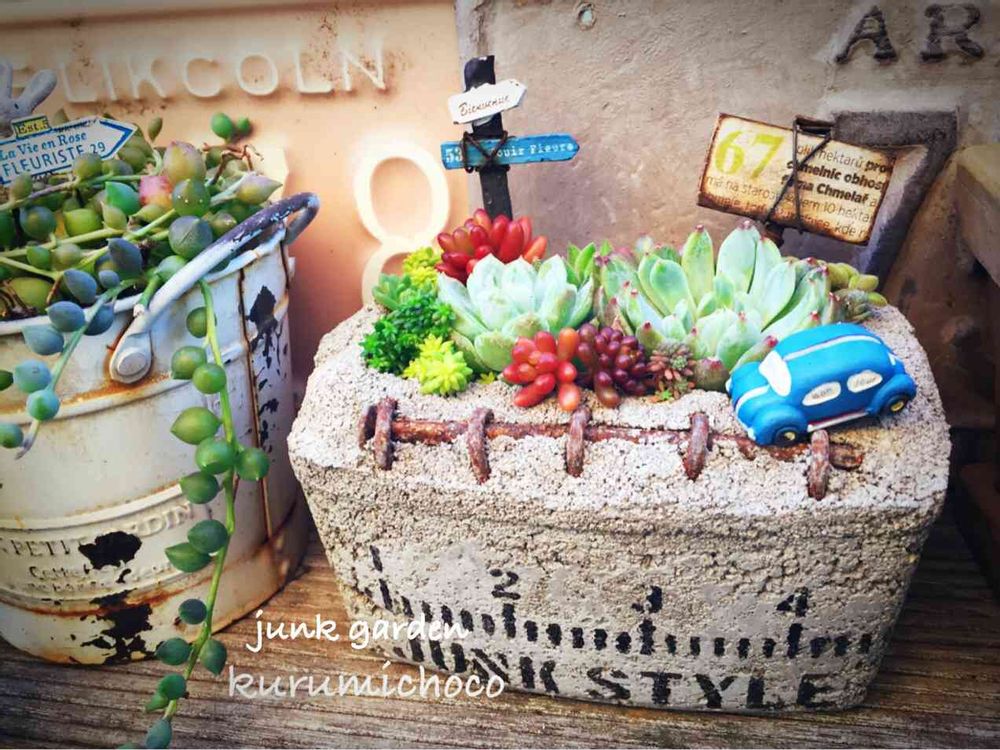 小さめの子達とうちにあった雑貨で寄せ植えしたよ〜やっぱりikuraさんのマジックだぁ〜笑