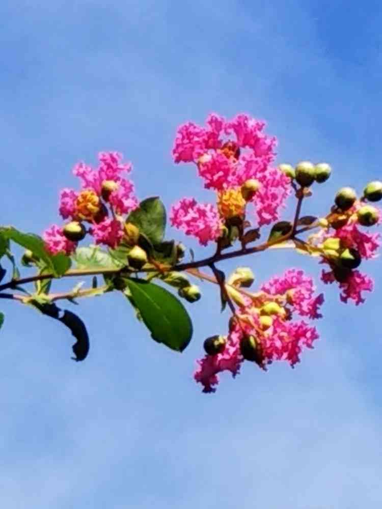 目の覚めるような青空に濃い紅色の百日紅🎵