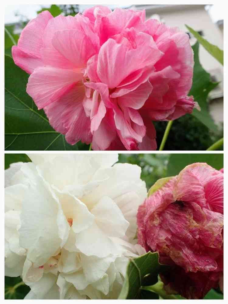楠玉酔芙蓉です。咲き始めは白くて、徐々に色付き、夕刻には濃いピンクになります。最後は下右のようになって終わります。今年はなんだかやたら背が高くなり、開花も遅くなって今頃となりました。