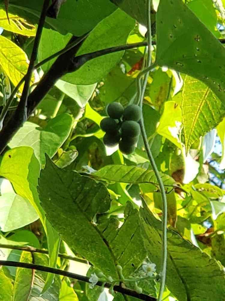 里山にて、ツタが木に絡まっていて実がついていて花も咲いてました。
