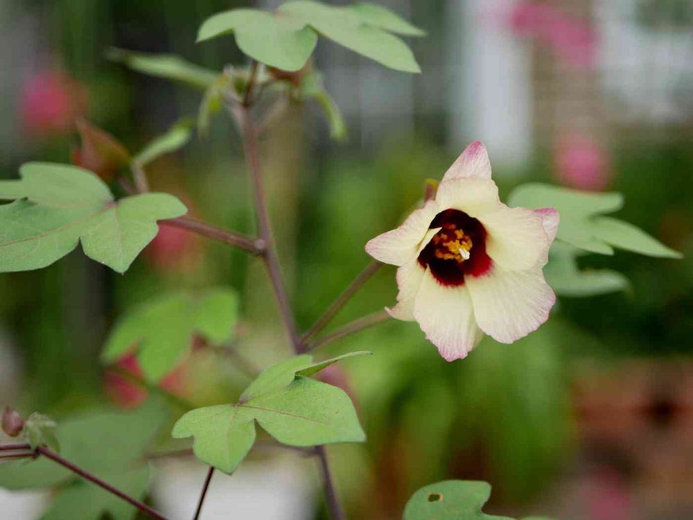 花はオクラの花に似ているけれど、大きさは2周り位小さ目で、蕾が紫っぽい濃茶のほおずきみたいな形です。