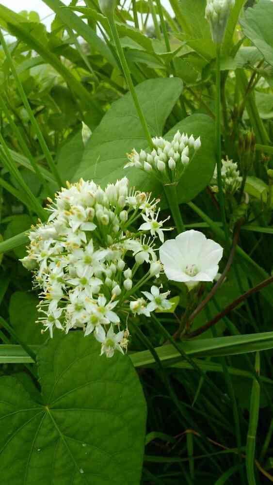 散歩中ニラの真っ白なお花の横に可愛いアサガオが咲いています。