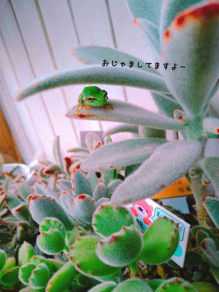 メンタルが弱ってるので、多肉見ていやされよーって見てたら🐸さんが月兎耳に仮住まいさせてもらってたよ😆