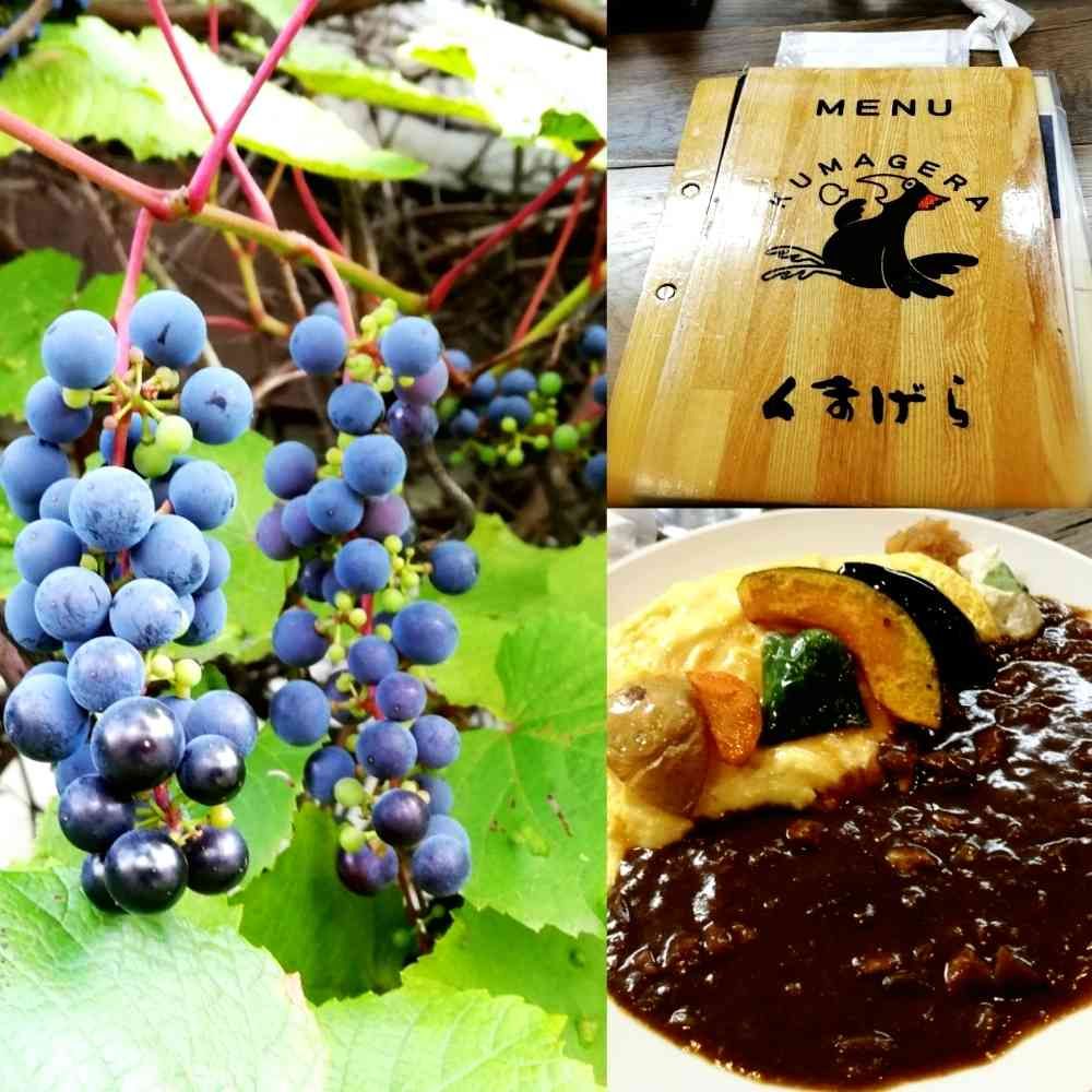 青い池を初観光して 遅めのお昼は、富良野グルメで検索して、オススメの『オムカレー』を食べに😋~で…、満腹でお店を出ると、なんと お店の壁に たわわに 葡萄🍇が~。これまた、食後のデザートを頂いた感じでした(笑) 🍇 🍇 🍇