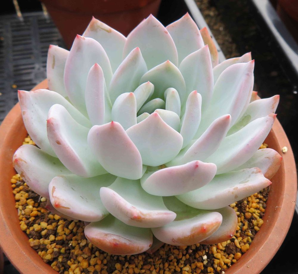 夏の間に白さが増したソンヨウン。ただ白いだけではなく、葉の内側と外側にはそれぞれほのかな緑とピンクが混ざっていてなんともいえない見事な色合いを作り出している。