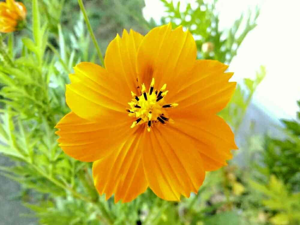 日の光が当たって若干明るく見えるのかもしれません。キバナコスモスってオレンジ系が多いですよね。光の当たり具合や写真を撮る時にカメラ内にどの程度、光を取り込むかによって見え方が変わって来ますよ。