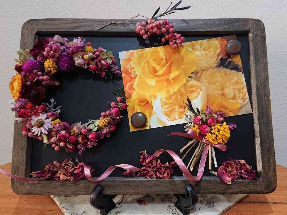 お花のlessonで作ったwelcomeボードにバラの写真を貼ってみました😁