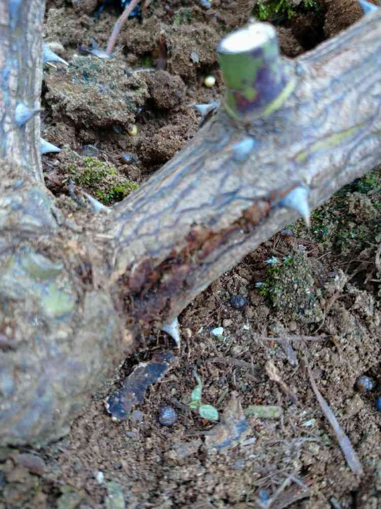 バラの夏剪定をしたら根本に虫に食われたようなあとが…。