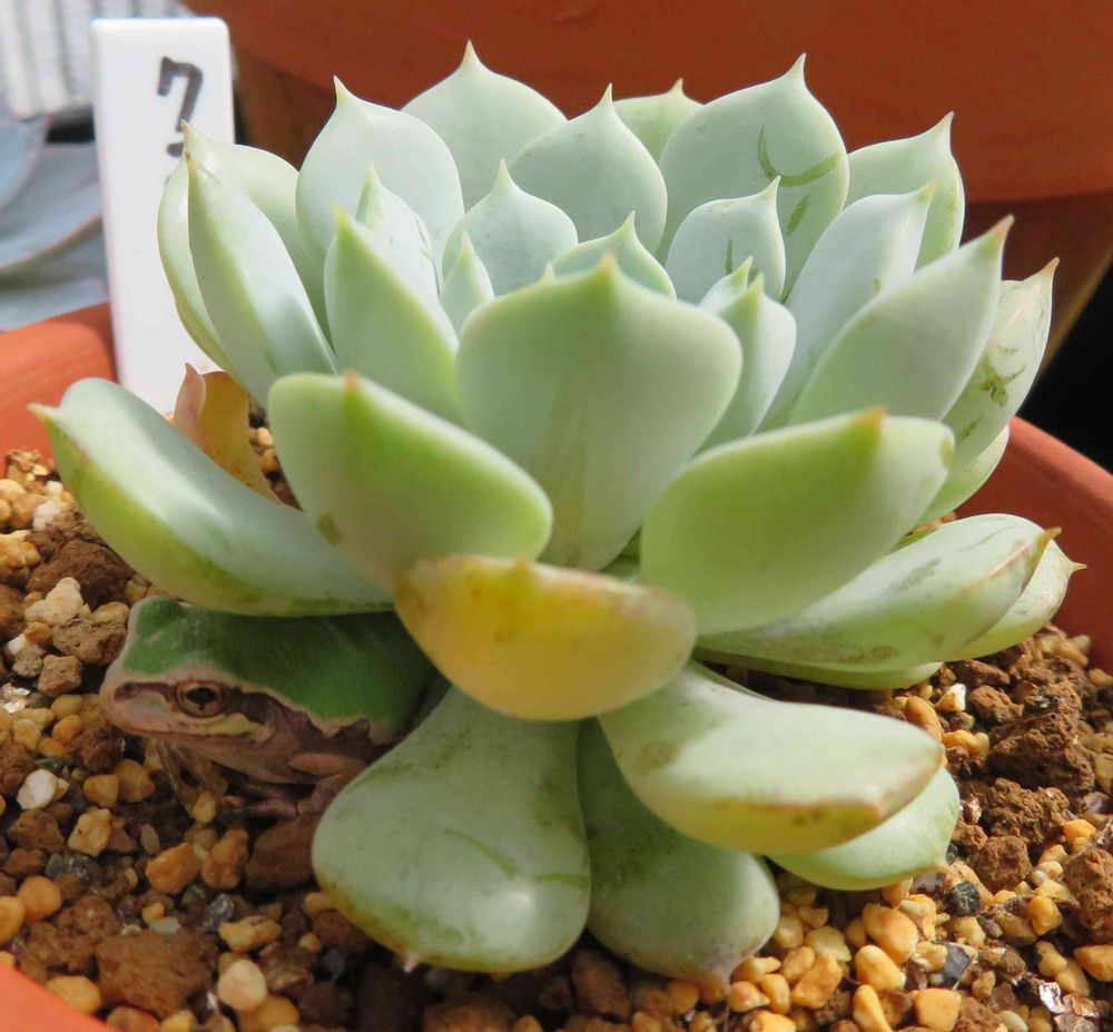 エケベリアのクララの葉の一枚と化すかえる。珍しくうまく化けていて撮るまで気が付かなかった。