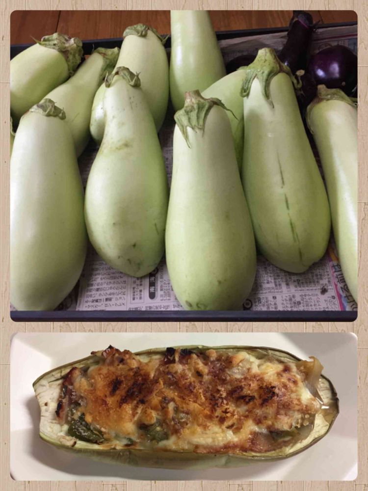 中をくり抜いて、その中に具を入れるのよ。茄子のグラタンです😋